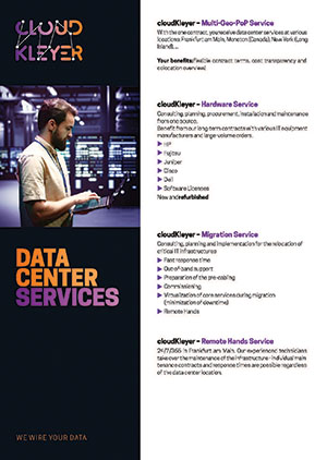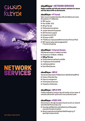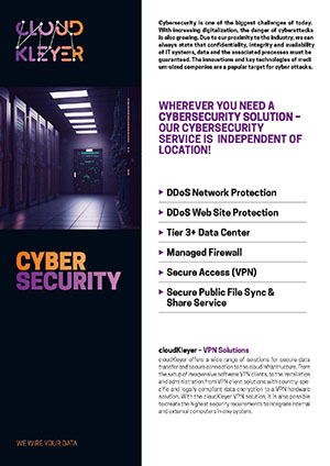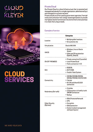Auf dieser Seite können Sie Präsentationen mit vollständiger Beschreibung der Dienstleistungen von CloudKleyer herunterladen. Rechtliche Dokumentation wie SLA und NDA finden Sie auf der Seite Rechtsdokumente